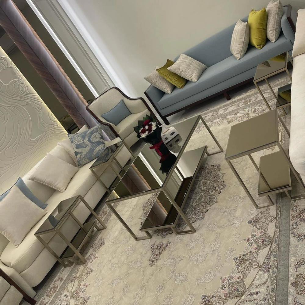 . وتتمثل النقطة المحورية في طاولة قهوة ذات مرآة مع رف سفلي، محاطة بعدة طاولات خدمة أصغر حجمًا ومتطابقة. والأسلوب معاصر وفخم،