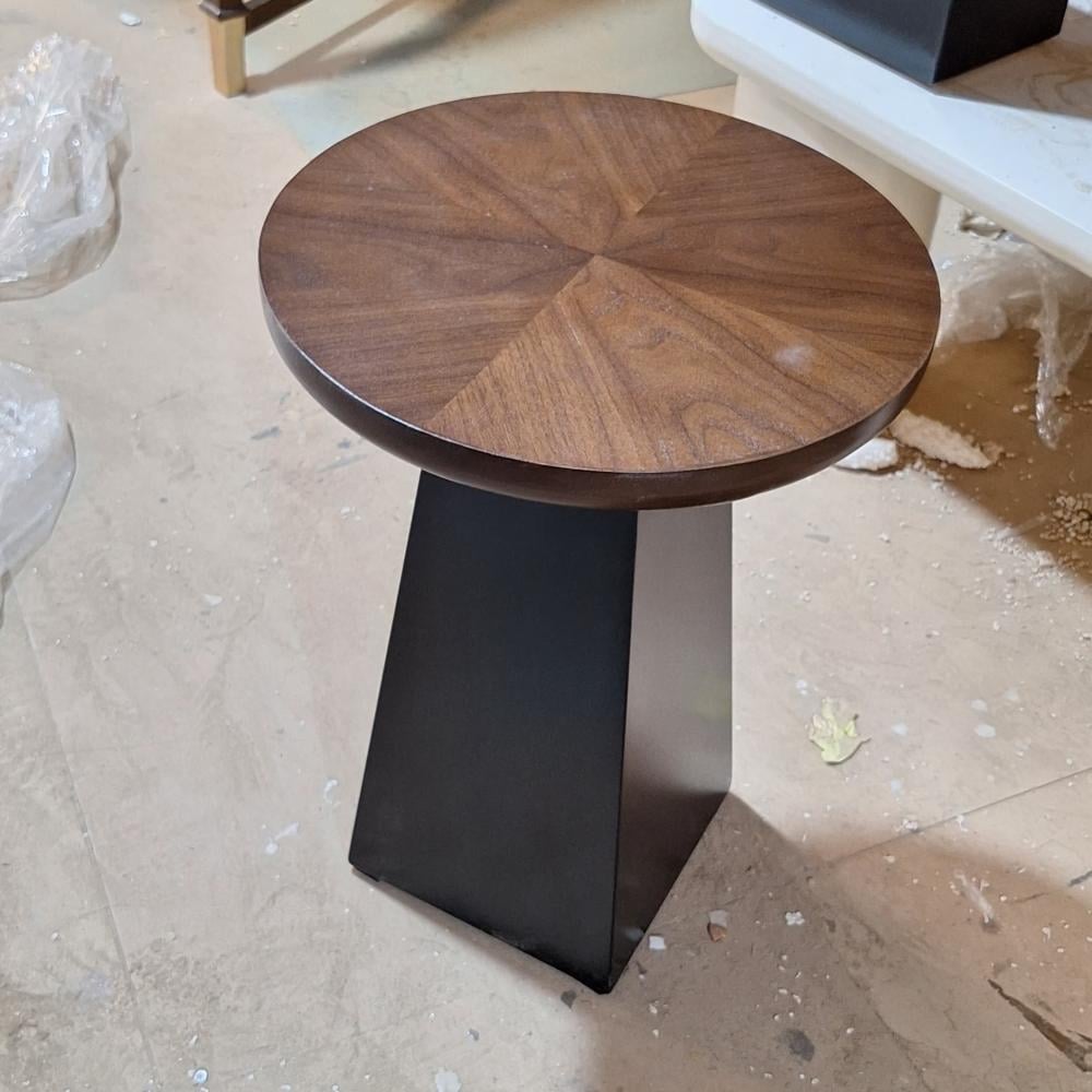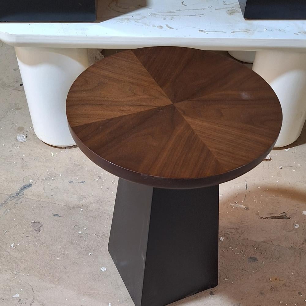 طاولة دائرية صغيرة ذات تصميم معاصر. سطح الطاولة مصنوع من الخشب جوزل الداكن مع نقشة هندسية على شكل مربعات متداخلة، مما يضيف إليها لمسة فنية. قاعدة الطاولة عبارة عن شكل هندسي خشب اسود مطفي ، بلون داكن يتناقض مع سطح الطاولة.
