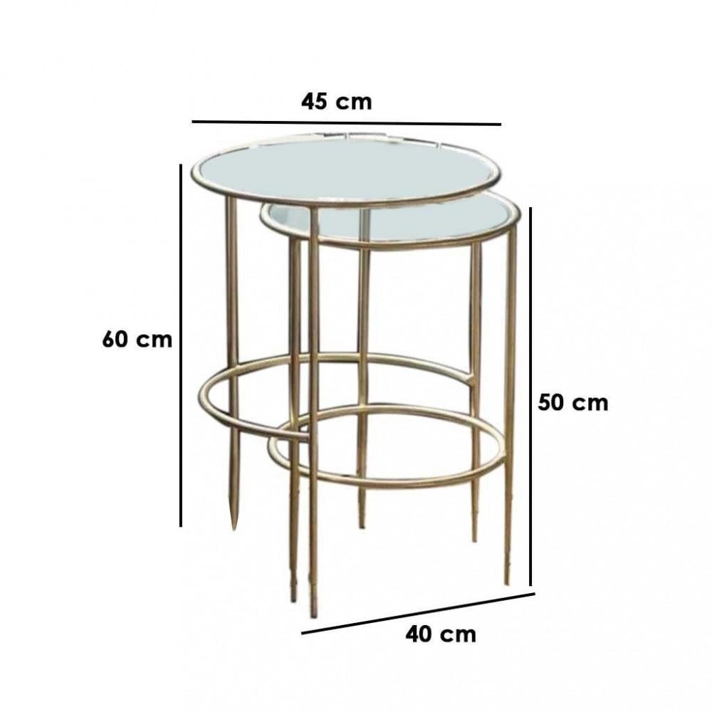 اللون: ذهبيالطاولة الكبيرة:الإرتفاع(سم): 60الطول(سم): 45الطاولة الصغيرة:الإرتفاع(سم): 50الطول(سم): 40الخامة الأساسية: حديدخامة السطح: زجاجبلد المنشأ: المملكة العربية السعودية