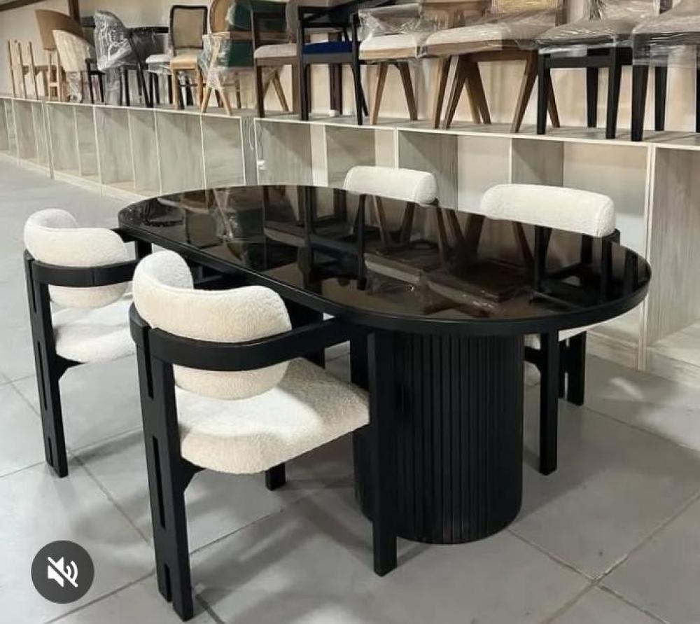 طاولة طعام حديثة بتصميم أنيق مع كراسي فخمة.