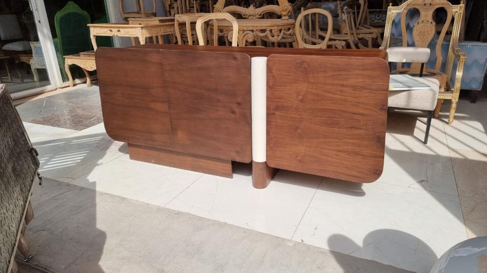 بوفية قشرة جوز بتصميم مميز بتقسيمات ودوران لابواب البوفيه من جوا رفوف مقاس مترين في ٥٠ ارتفاع ٩٠سم مدة التنفيذ ١٠يوم للعميل اختيار الوان الخشب