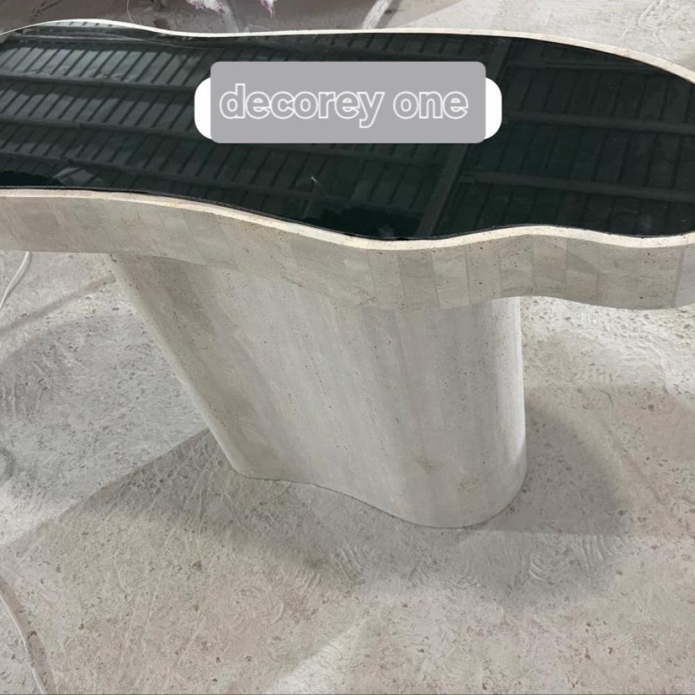 تصميم جديد وحديث برخام ترفنتينو طبيعي مع إضافة سطح قزاز اسود بشكل بيضاوي مقاس 120*40*80مدة التفصيل ١٠يوم