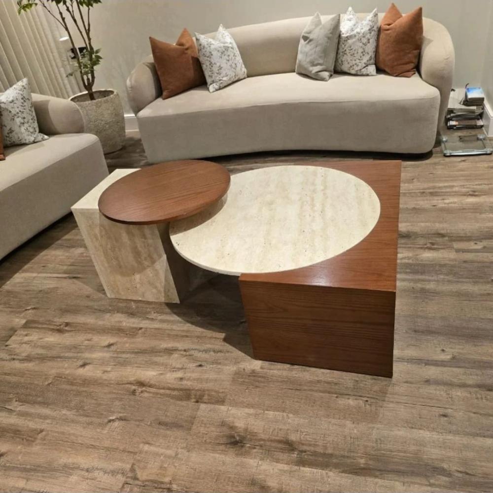 طاوله وسط قطعتين بخشب سنديان مع رخام ترفنتينو طبيعي