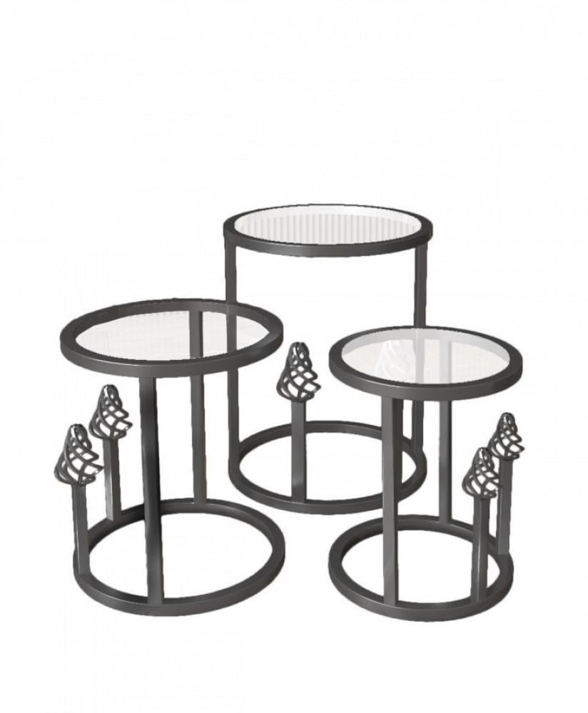 ثلاث طاولات خدمة بمقاسات مختلفه بحيث تستطيع ادخال جميع الطاولات في داخل بعضها ، والرف يتكون من زجاج.