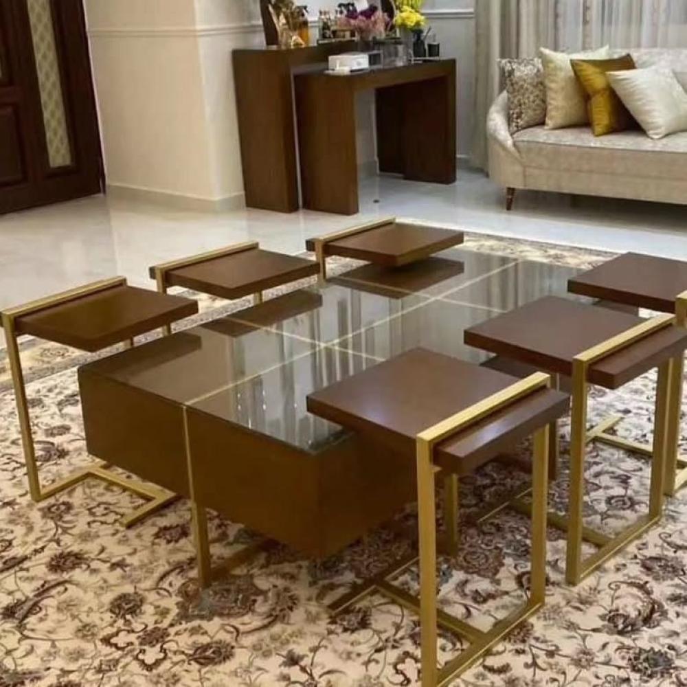 طقم طاولة قهوة فريد ومبتكر. يتكون الطقم من طاولة مركزية مربعة الشكل، يبدو سطحها مصنوعًا من الزجاج الشفاف، وتحته قاعدة خشبية بنية داكنة.
