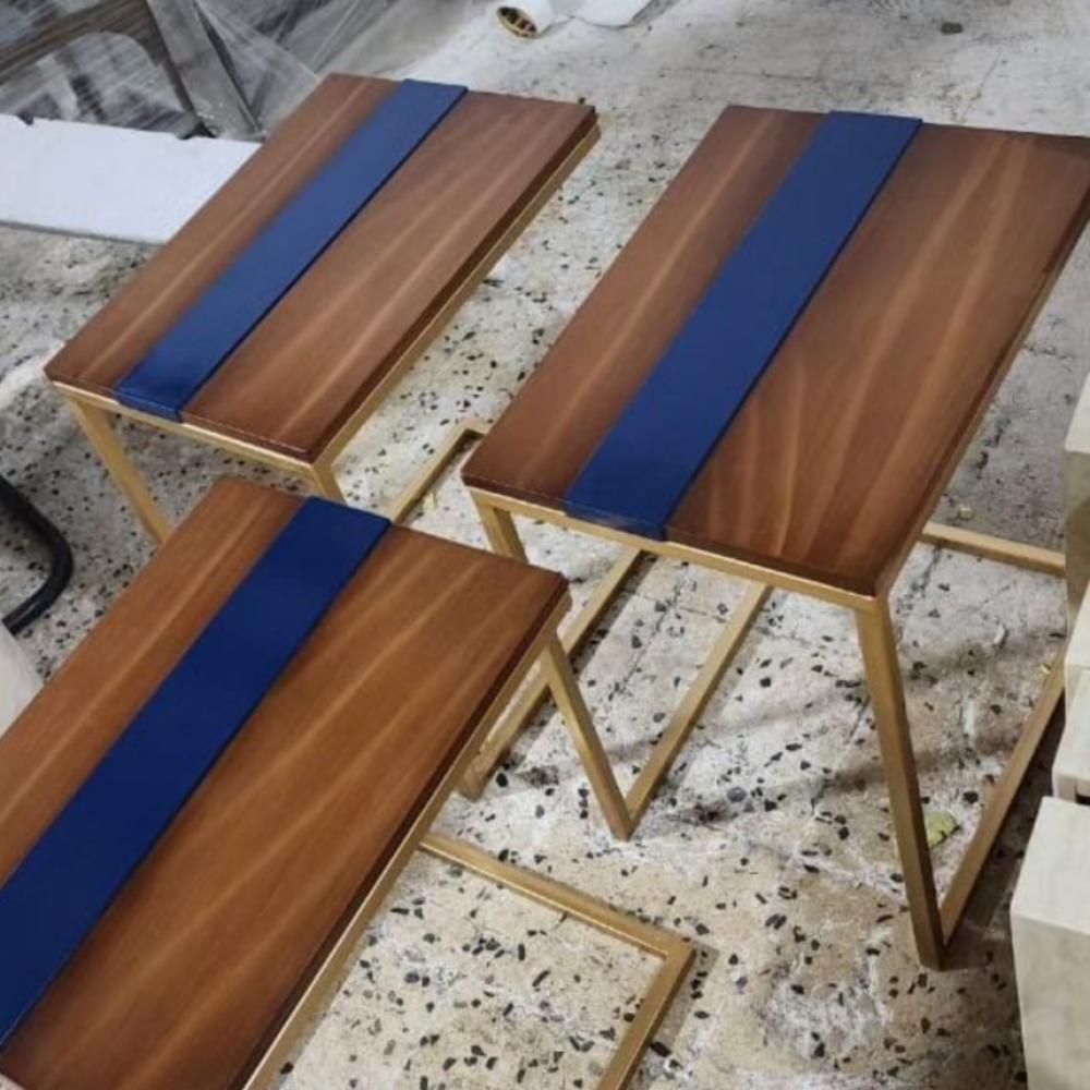 طاوله خدمه بسطح خشب مستطيل بلوت تعتيق أنيق باطار أزرق غامق بقاعده حديد لون ذهبي مقاس50×35×55للعميل اختيار الوان الحديد والخشب مدة التنفيذ 10يوم
