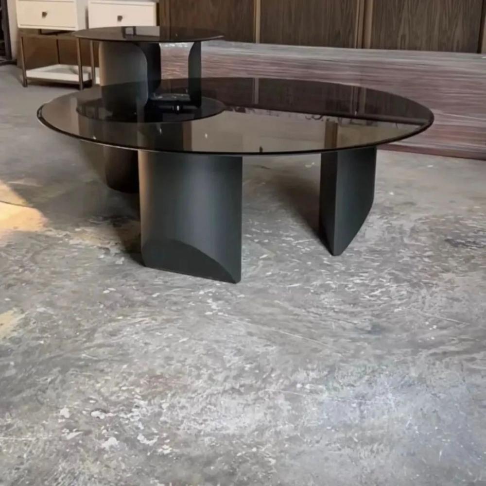 طاولة ضيافة حديداسود بسطح قزاز ٨مل عسلي