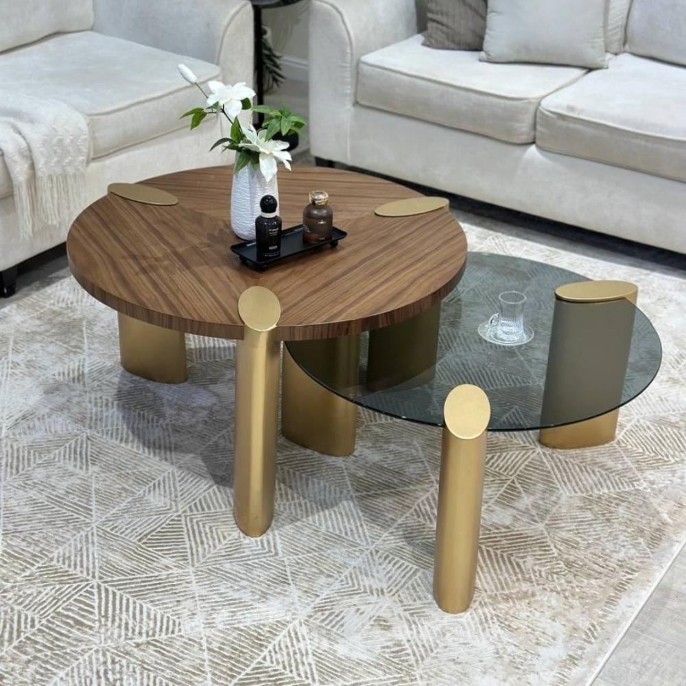 طاولة قهوه قطعتين بتصميم حديث وانيق بلونهاالبني مع الذهبي